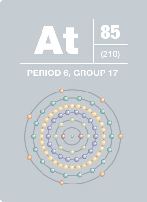 Astatine is the heaviest of the halogens and is essentially unavailable in nature with less than one teaspoon of the element found in the Earth’s crust at any one time. In 1940, D. R. Corson, K.R. MacKenzie, and Emilio Segre of the University of California, Berkeley discovered that the only possible way of producing astatine is by bombarding bismuth with energetic alpha particles. Similar to the metallic element iodine, astatine accumulates in the thyroid gland.